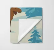 Design minimalista con un alce in una foresta di conifere con abeti o abeti rossi coperti di neve. Design decorativo invernale con un tipico animale selvatico scandinavo, originario tra l'altro di Svezia, Norvegia e Finlandia.