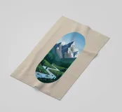 Un'illustrazione minimalista dal design piatto che cattura la bellezza di una valle di montagna. La scena è caratterizzata da maestose cime innevate che sovrastano un prato verde e rigoglioso, attraversato da un fiume tortuoso. I punti salienti includono fitte foreste di pini, un escursionista sulla riva del fiume e vivaci fiori selvatici, il tutto incorniciato in un'elegante capsula verticale. La tavolozza dei colori è moderna, dominata da blu freddi, bianchi e varie tonalità di verde. Illustrazione, Montagna, Natura, Paesaggio, Flat Design, Arte vettoriale, Alpino, Valle, Fiume, Escursionista, Trekking, Foresta, Pini, Cime innevate, Minimalista, Viaggio, Avventura, Ou