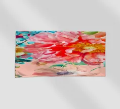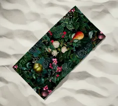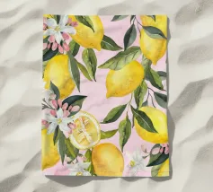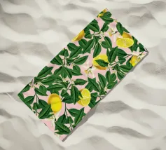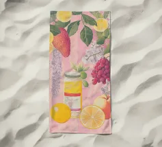 Un collage colorato di frutta fresca e fiori di ciliegio in tenui colori pastello che dà vita all'estate su uno sfondo rosa. Ideale per gli amanti del mercato della frutta e della natura!