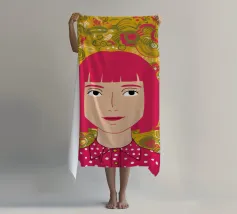 Ritratto moderno e artistico di una donna con capelli corti blu e camicia a righe arancioni e bianche. Il suo sguardo diretto e riflessivo e i colori decisi creano un'immagine suggestiva e memorabile.