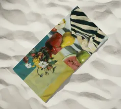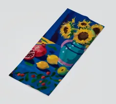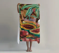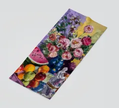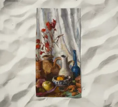 Una natura morta rustica e calda con una chitarra, una brocca, un'anguria e dell'uva. La composizione evoca un senso di vita di campagna piacevole e creativa, con toni caldi e terrosi e una disposizione rilassata e armoniosa.