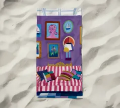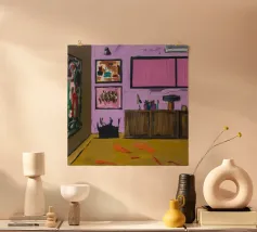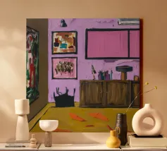 L'ambiente interno è caratterizzato da pareti rosa caldo, un mobile in legno che espone oggetti decorativi, una parete di galleria eclettica e una vista su una stanza adiacente.