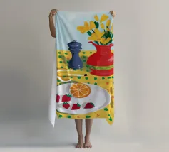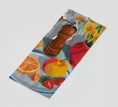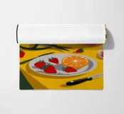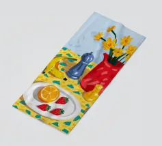A beautifully chaotic still life of an artist or crafter table, with scissors, fruit, and other objects. The rich colors and dynamic composition celebrate the beauty in creative mess.