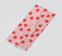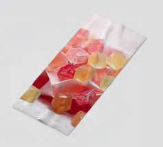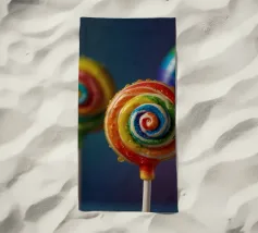 Un vivace mix di caramelle è distribuito su una superficie rosa, che mostra varie forme e colori, tra cui lecca-lecca roteanti e dolciumi rotondi. Questa disposizione giocosa invita a una gioiosa indulgenza.