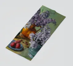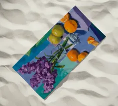 Una vivace composizione di natura morta con profumati lillà viola in un vaso blu intenso, accanto a un vaso blu più piccolo, mele verdi e limoni gialli, il tutto su un allegro sfondo giallo.