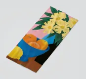 Un'elegante e semplice natura morta con un bouquet di fiori gialli in un vaso scuro accanto a una ciotola blu profondo piena di arance fresche. La composizione è serena e senza tempo, con un bel contrasto di colori.