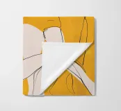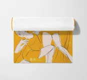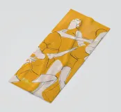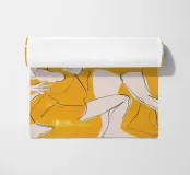 Un'opera d'arte astratta di figure femminili danzanti delineate in nero su uno sfondo giallo vibrante, che esprime ritmo e movimento in uno stile minimalista.