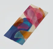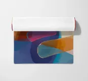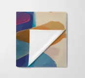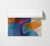 Una composizione astratta di forme traslucide che scorrono e si sovrappongono nei toni caldi del rosa, dell'arancione e del beige, con elementi blu a contrasto, creando un morbido e onirico balletto di forme.