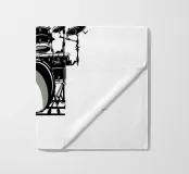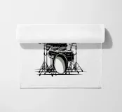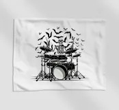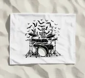 Illustrazione di uno scheletro percussionista che suona una batteria, in una tavolozza nera e grigia con accenti bianchi. Uno stile scuro e diretto, ideale per magliette rock e goth e abbigliamento dark.