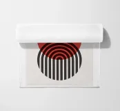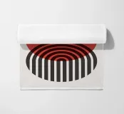 A bold Bauhaus-inspired abstract design featuring layered red circles and rhythmic black vertical lines. A striking modern statement piece perfect for contemporary interiors.