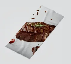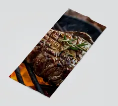 Una bella bistecca alla griglia è adagiata su un piatto bianco, ornato dai segni della griglia. La calda luce del sole mette in risalto i suoi colori ricchi, creando un'atmosfera invitante perfetta per il pranzo.