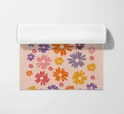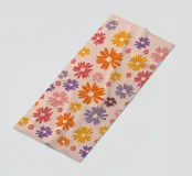 Un motivo floreale giocoso che sembra una passeggiata visiva in un festival di giardini retrò: I fiori stilizzati, nei colori arancione, rosa, viola, rosso e giallo, danzano liberamente. Ogni fiore ha una forma semplice, simile a una margherita, con lunghi petali a raggiera che emergono da un punto centrale. La disposizione è volutamente irregolare, come un disegno sparso di gioia, estate e nostalgia.