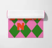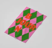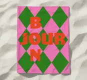 Questo motivo presenta l'allegra scritta "BON JOUR" in arancione brillante, disposta in modo dinamico su un motivo di rombi verdi su sfondo rosa. I forti contrasti di colore e la tipografia giocosa conferiscono all'immagine un aspetto fresco, energico e moderno. Ha un effetto amichevole e invitante e diffonde immediatamente il buon umore.