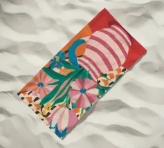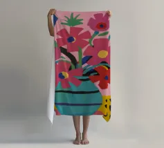 Una vibrante ed eclettica natura morta con un bouquet di fiori in due vasi con motivi diversi, uno a macchie e uno a ghirigori. La tovaglia a motivi aggiunge un mix gioioso e massimalista di colori e design.