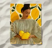 Fresco come un limone e sorprendentemente composto ad arte: Questo motivo combina in modo sorprendente fotografia e pittura. Le strisce chiare dell'indumento contrastano sottilmente con il giocoso motivo del limone sullo sfondo: un dialogo tra struttura e spontaneità. La posa calma della donna e i toni gialli brillanti creano un effetto tranquillo ma intenso. L'occhio non si stanca mai di capire cosa è fotografato e cosa è dipinto. Ideale per ambienti moderni, molto luminosi, con carattere e molta leggerezza mediterranea: case di vacanza, appartamenti, monolocali o per la casa.