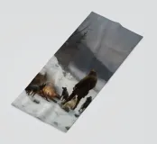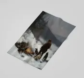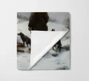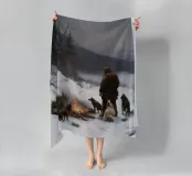 Un suggestivo motivo invernale: un cacciatore si trova con i suoi cani accanto a un falò riscaldante nel mezzo di un paesaggio montano innevato. L'immagine trasmette un senso di avventura, vicinanza alla natura e la tranquilla bellezza dell'inverno. I caldi accenti di luce del fuoco contrastano con il fresco paesaggio innevato e creano un'atmosfera suggestiva. Ideale per murales, tazze, cuscini o tessuti: un disegno unico per tutti coloro che amano l'aria aperta, la caccia, la natura e il romanticismo dell'inverno.