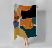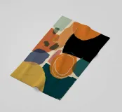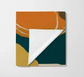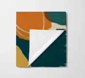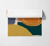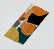Un'opera d'arte astratta con una composizione calda e invitante di forme organiche sovrapposte in una tavolozza di terracotta, marrone e giallo senape. L'opera è moderna, rilassante e ricca di calore testuale.