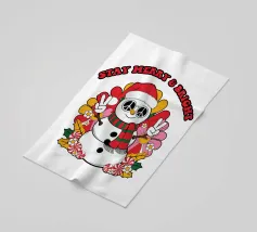 Un omino di pan di zenzero che indossa un cappello da Babbo Natale va allegramente in skateboard. La scritta "Can't Catch Me" aggiunge un tocco giocoso sopra il personaggio.