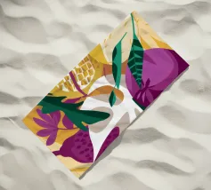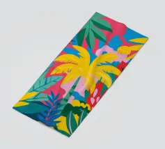 Un'esplosione caotica e cromatica di foglie colorate e sovrapposte crea un modello di giungla vibrante, energico e coinvolgente, pieno di vita e movimento.