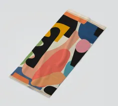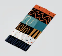 Una composizione astratta verticale con una cascata di forme e motivi colorati e ritmici, tra cui onde, griglie e forme organiche, in una tavolozza di arancione, blu e verde acqua.