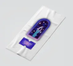 Chiave dal design cromato iridescente in un sacchetto di plastica testurizzato