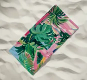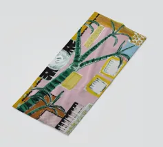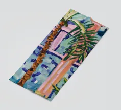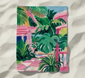 An elegant, tranquil scene featuring pink architectural elements, a patterned pathway, and lush green palm leaves, suggesting a modern and chic tropical resort.