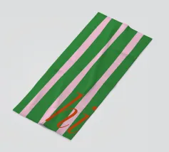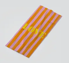 Il design combina la scritta verticale "Ciao" in giallo brillante con uno sfondo vivace di pennellate irregolari in arancione e rosa. Questa scelta cromatica ricorda i bar estivi sulla spiaggia, le tende da sole italiane e la spensieratezza della vita al sud.
