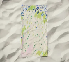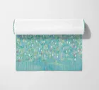 This image depicts an abstract painting characterized by a multitude of short, vertical brushstrokes in a variety of colors set against a soft blue background. The strokes create a textured and rhythmic surface that gives the impression of gentle movement or perhaps falling rain. There is a sense of depth created by the layering of paint, with hints of warmer tones peeking through cooler ones. The overall effect is calming and reminiscent of nature's elements, evoking feelings similar to watching light reflections on water or leaves rustling in the breeze.