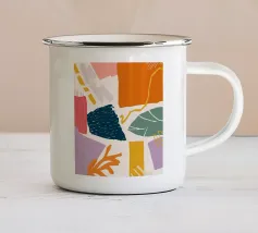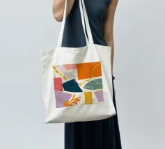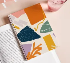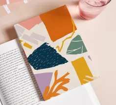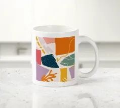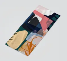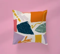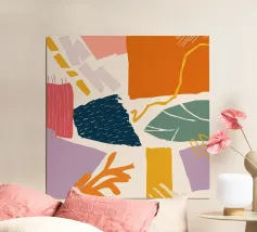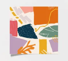 Un collage astratto di forme frantumate e sovrapposte in una vibrante tavolozza di arancione, blu e rosa crea una composizione dinamica, energica e moderna.