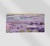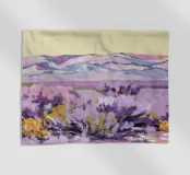 Colline ondulate ricoperte di una soffice e vaporosa lavanda si estendono verso una lontana e pallida catena montuosa. I colori delicati e la messa a fuoco morbida creano un paesaggio sognante, tranquillo e suggestivo.