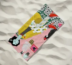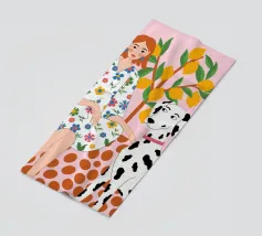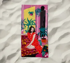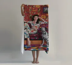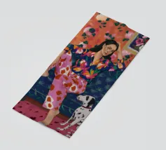 Una donna si trova in una cucina dai colori vivaci con un dalmata al suo fianco, una finestra che mostra una scena all'aperto e vari dettagli della cucina, creando un'illustrazione domestica eccentrica e affascinante.