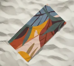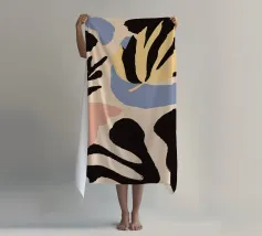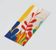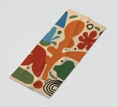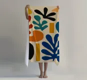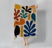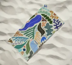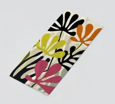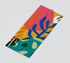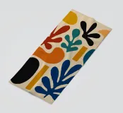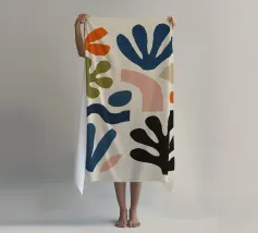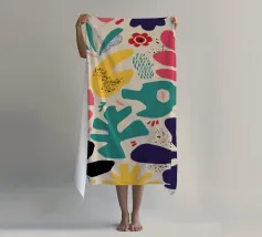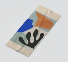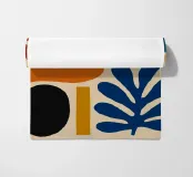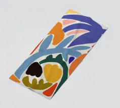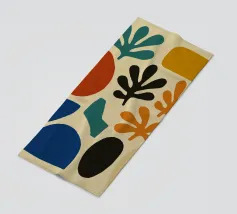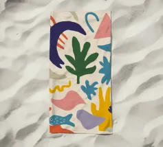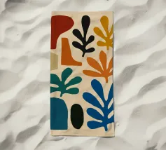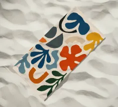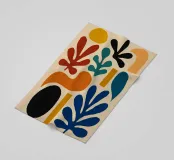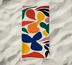 Una varietà di forme astratte dai colori vivaci sono disposte su uno sfondo neutro. La composizione presenta forme organiche che ricordano foglie e ovali.