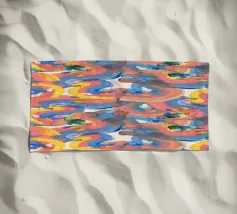 A vibrant and colorful pattern features a variety of shapes in red, blue, orange, and green. Repeated in a symmetrical arrangement, the design creates an eye-catching visual rhythm.
