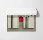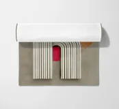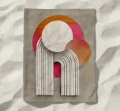 This abstract Bauhaus inspiration combines geometry and symmetry in a modern design. With circles, semi-circles and stripes in grey, orange and pink, the illustration creates a harmonious interplay of colours. The retro-architectural shapes give the artwork a minimalist and structured aesthetic.