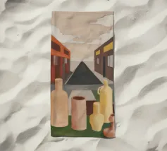 Un sentiero giallo brillante si snoda elegantemente attraverso un paesaggio minimalista di edifici grigi e squadrati. Il dipinto è uno studio sul contrasto dei colori e sulle forme geometriche pulite, che creano una scena urbana serena ma di grande impatto visivo.