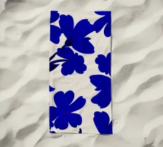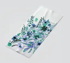 Quest'opera d'arte presenta una delicata disposizione di forme floreali astratte, dipinte con acquerello indaco. I fiori appaiono sparsi lungo una sottile e sinuosa liana che attraversa verticalmente la composizione. I petali variano nella tonalità di colore, da un tenue slavato a un blu intenso, creando un senso di movimento e di ritmo organico sullo sfondo neutro.