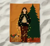 Illustrazione stravagante di una giovane donna a casa che decora il suo albero di Natale. Le luci natalizie sono aggrovigliate intorno al suo corpo.