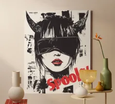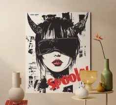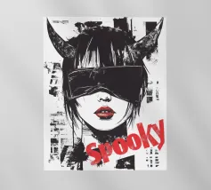 Una misteriosa demonessa con una benda e seducenti labbra rosse domina questa composizione oscuramente erotica. L'estetica grunge ricorda i manifesti punk degli anni '80, mentre la scritta "Spooky" in rosso sangue rafforza l'atmosfera di Halloween. I contrasti in bianco e nero con accenti rossi mirati creano una tensione drammatica. Questo provocatorio mix di gotico e street art trasforma la moda in dichiarazioni ribelli, perfette per chiunque ami il lato oscuro!