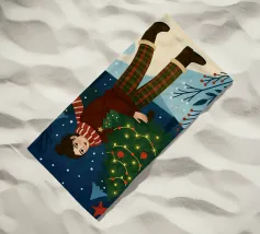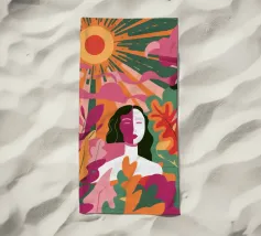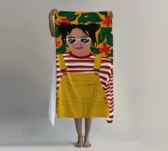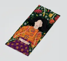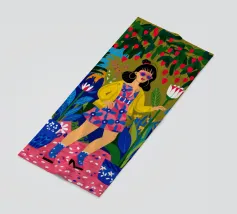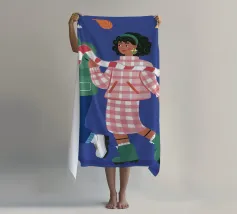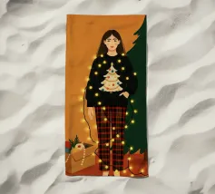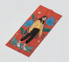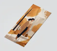 Una scena autunnale con una giovane donna che cammina lungo un sentiero che attraversa una colorata foresta autunnale. Lo sfondo è di un vivace azzurro cielo, che crea un contrasto deciso con le tonalità calde delle foglie e del fogliame autunnale. La donna indossa uno spesso maglione marrone, una sciarpa giallo senape avvolta attorno al collo e pantaloni a righe verticali arancioni, gialle e bianche che riprendono le tonalità autunnali circostanti.