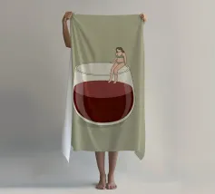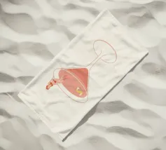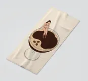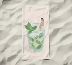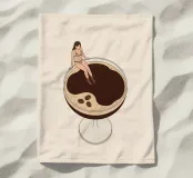 Illustrazione originale di una donna in miniatura in costume da bagno che immerge le gambe in un bicchiere di Espresso Martini. La superficie nera e spumosa del cocktail mette in risalto i chicchi di caffè galleggianti, creando un'atmosfera chic, energica ed estiva. Questa scena poetica fonde il mondo del caffè con quello delle vacanze. Perfetta per un bar, una caffetteria o un'area relax dall'estetica contemporanea.