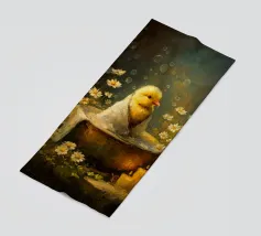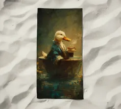 Un simpatico anatroccolo fa capolino da sotto un morbido asciugamano bianco. Le sue soffici piume gialle e i suoi occhi curiosi creano una scena adorabile e affascinante.