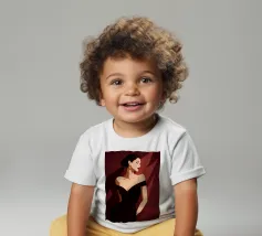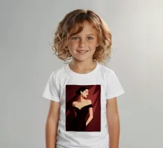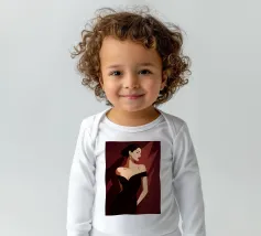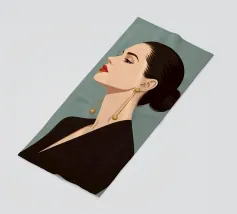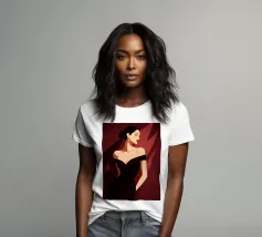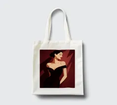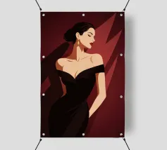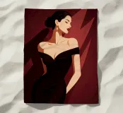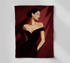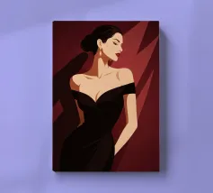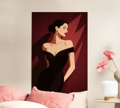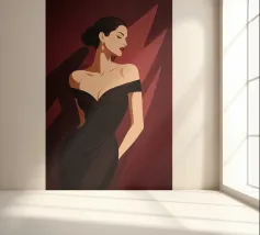 Sophisticated illustration of a woman in a black gown with a sleek updo, set against a deep burgundy geometric background.