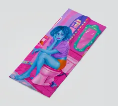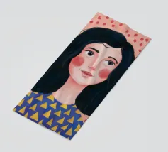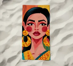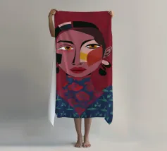 Questo dipinto raffigura una persona con i capelli neri che indossa un abito colorato con forme geometriche. Lo sfondo è rosso e la persona è adornata con grandi orecchini circolari.