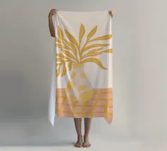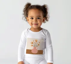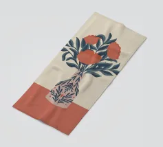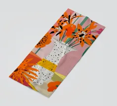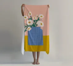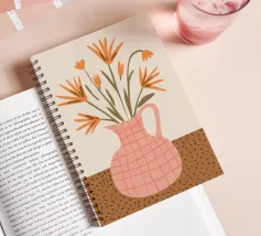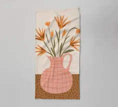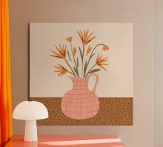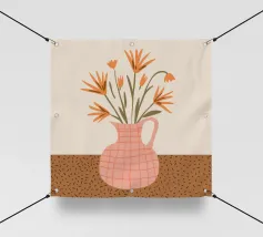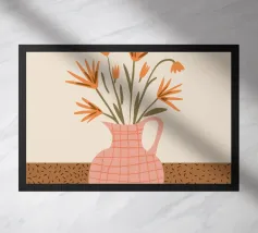 Un'affascinante natura morta con un bouquet di semplici fiori arancioni in un grazioso vaso rosa con motivo a scacchiera. La composizione su una superficie punteggiata è moderna, dolce e con un'estetica delicata e calda.
