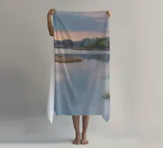 Un fiume al crepuscolo con colori tenui e un'atmosfera tranquilla.
