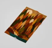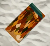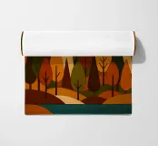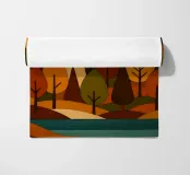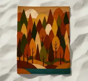 Una scena di foresta stilizzata e armoniosa con fiume, ricca di calde tonalità autunnali in un effetto legno con legni colorati. (Una miscela di forme geometriche e curve morbide per formare gli alberi, ciascuno con una combinazione unica di colori come l'arancione bruciato, il verde intenso, il giallo oro e il marrone terroso. Questi colori si fondono magnificamente, evocando la sensazione dell'autunno, quando la tavolozza della natura è al suo massimo splendore.
