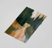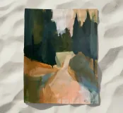 Paesaggio astratto dipinto con verdi profondi e calde tonalità della terra, che suggerisce un tranquillo sentiero nella foresta immerso in una luce soffusa.