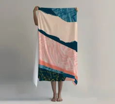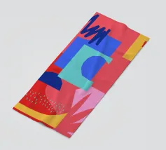 Forme geometriche audaci in blu, giallo e rosa contrastano con uno sfondo neutro. Ombre organiche e punti colorati creano una composizione dinamica e astratta.