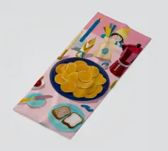 Pile di soffici pancake irrorati di sciroppo e ricoperti di burro sono serviti su piatti colorati, evocando la pura gioia di una perfetta colazione mattutina.