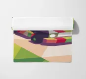 Illustrazione di un go-kart colorato su una pista con uno stile geometrico moderno.